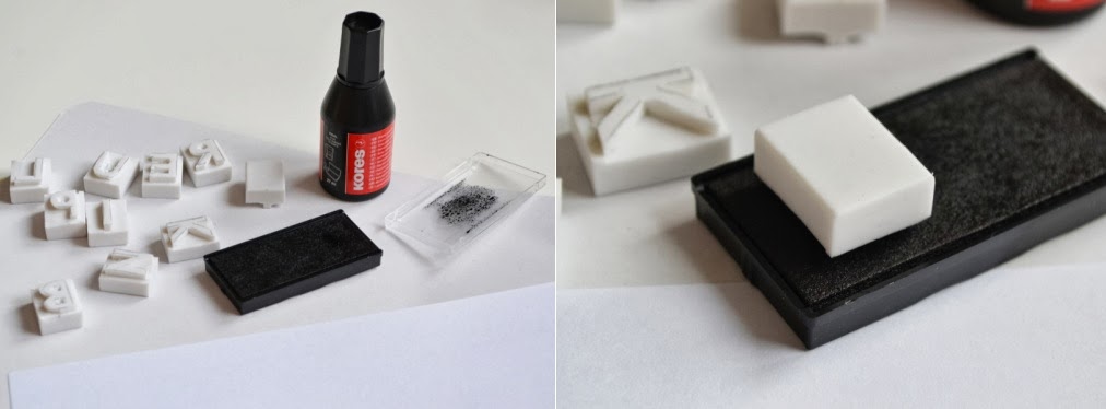 Vyříznutá razítka už stačí jen namočit do podušky napuštěné razítkovou barvou ( seženete obojí v papírnictví za pár korun, barva nemusí být jen černá, prodává se červená, modrá, zelená…) a otisknou na papír. Dejte pozor, ať je nenatisknete jinak otočená, než patří. Mě se podařilo vyříznout „N“ obráceně, ale naštěstí jsem nejdřív zkoušela tiskat na papír mimo, tak jsem na to přišla včas 🙂