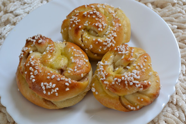 Dáme na plech na pečící papír, 3/4 hodiny necháme kynout na plechu, než dáme do trouby, potřeme rozšlehaným vejcem a posypeme perlovým cukrem. Mám ho dovezený ze Švédska, mívali ho v Ikea, ale myslím, že se dá sehnat i v Kauflandu. Je to nasekaný cukr, který se ani při vysokém stupni pečení nerozteče.