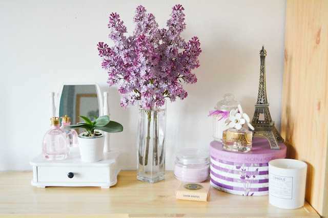 Paříž. To je prostě to, co mě napadne při pohledu na toto zátiší. S dominantou Eiffelovky to nejde snad ani jinak. Kovovou věž jsem sehnala před lety na Ebay a od té doby mi stále zdobí pokoj. Stojí na krabičce od kosmetiky z Tesca, kterou jsem si kdysi kupovala. A na krabičce jsou spolu s věžičkou i perfém Daisy od Marca Jacobse a po domácku dělaná voňavá sůl do koupele. Jak jinak, než s vůní levandule a s fialovou mašlí na hrdle sklenice!