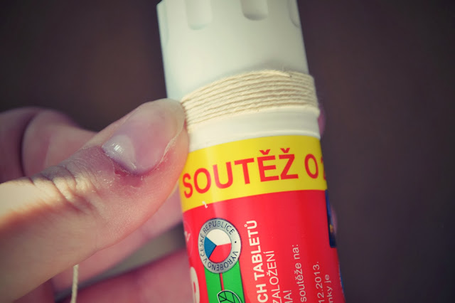 Svůj provázek jsem si namotala na plastovou ruličku od mašle, protože lepidlo běžně používám. Pokud si zvolíte ruličku od toaletního papíru, můžete si provázek klidně nechat na ní a podle potřeby odmotávat 🙂