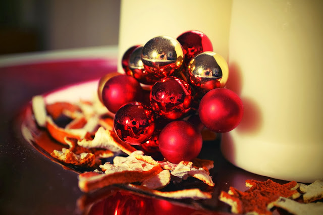 Svíčky jsem obsypala vykrájenou a nasušenou kůrou od mandarinek podle tohoto návodu a pak jen položila mezi svíčky svazek zlatých a červených ozdobiček. Hotovo! Celé to trvalo asi minutu, když pominu to dlouhé hledání talíře 🙂 Kůra mandarinek krásně provoní pokoj, a to je už rok stará! 🙂