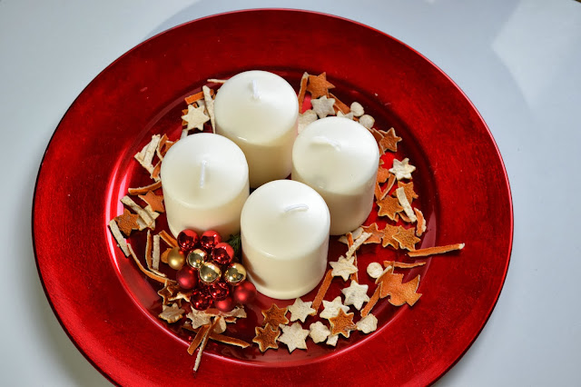 Moderně a jednoduše, jak jinak. U mě snad nic nemůže být složité! Použila jsem plastový talíř z Nanu Nana, který mám už od loňska a stál mě 30 Kč. Na ten jsem položila čtyři svíčky z Kiku, cena za všechny tuším 60 Kč?